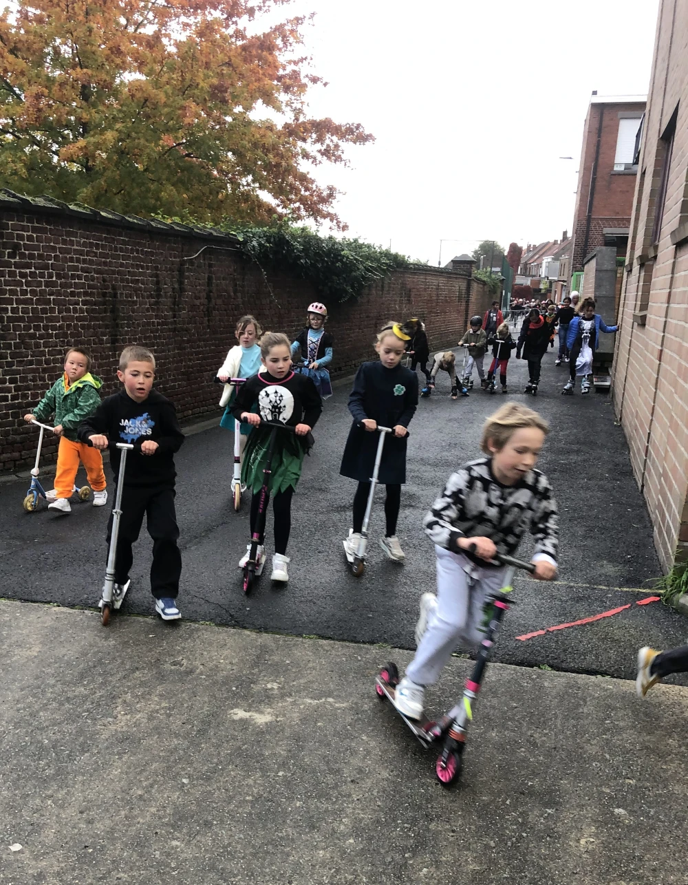 Op vrijdag 27 oktober was het dan eindelijk zover: 510 kleuters en leerlingen verzamelden op het Toyeplein, gewapend met steps, rolschaatsen, skeelers, skateboards en nog meer tuig op wieltjes.